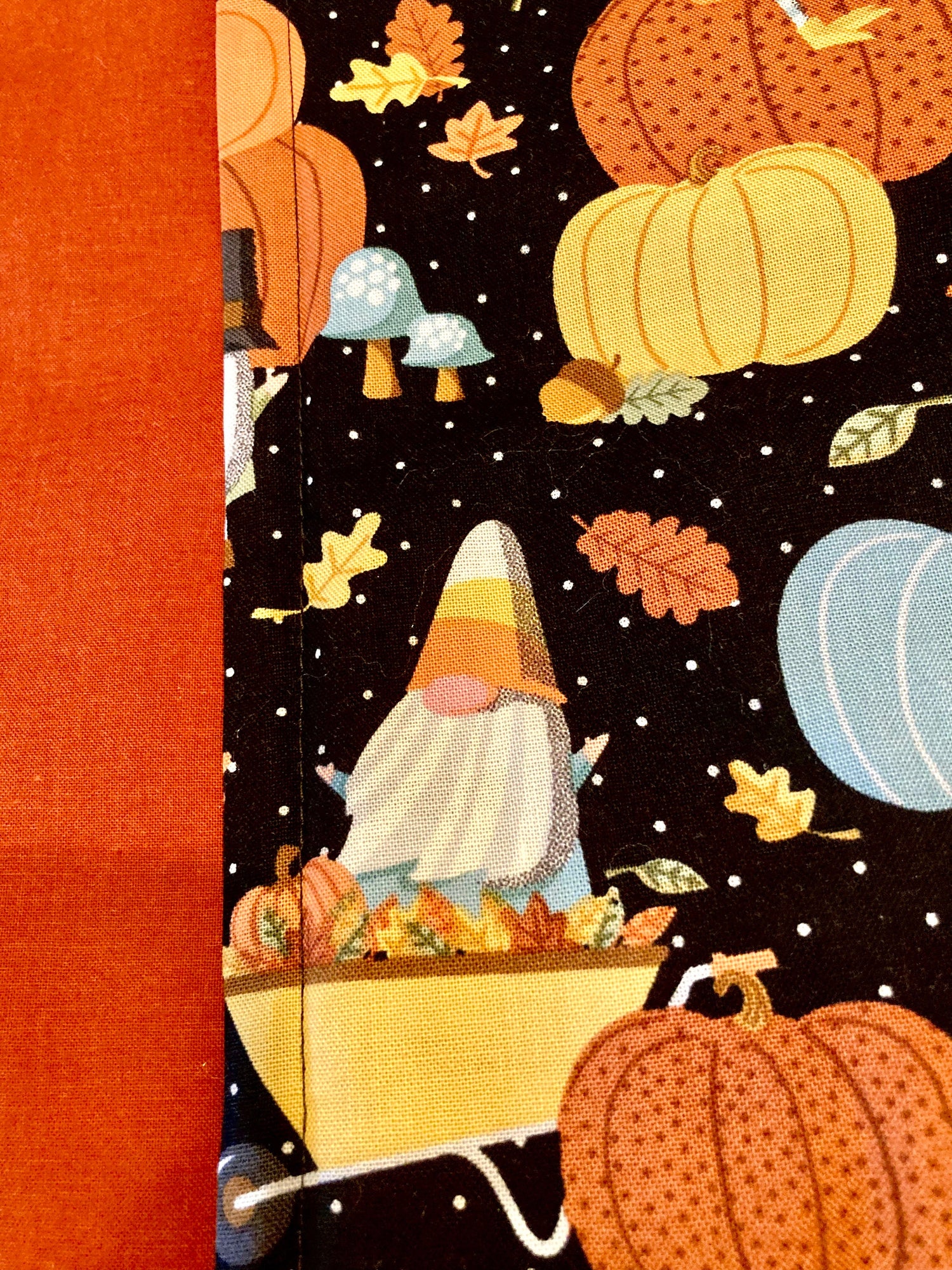 Who doesn’t love gnomes and fall? This blanket features adorable gnomes in colorful pumpkins, pilgrim gnomes and more… this blanket will make anyone smile! Then the reverse side is a solid rich soft burnt orange making it the best fall blanket ever! Handmade by Sisters Sewing Kindness Sue Grandi and Nancy Johnson. Free shipping and only one in stock!