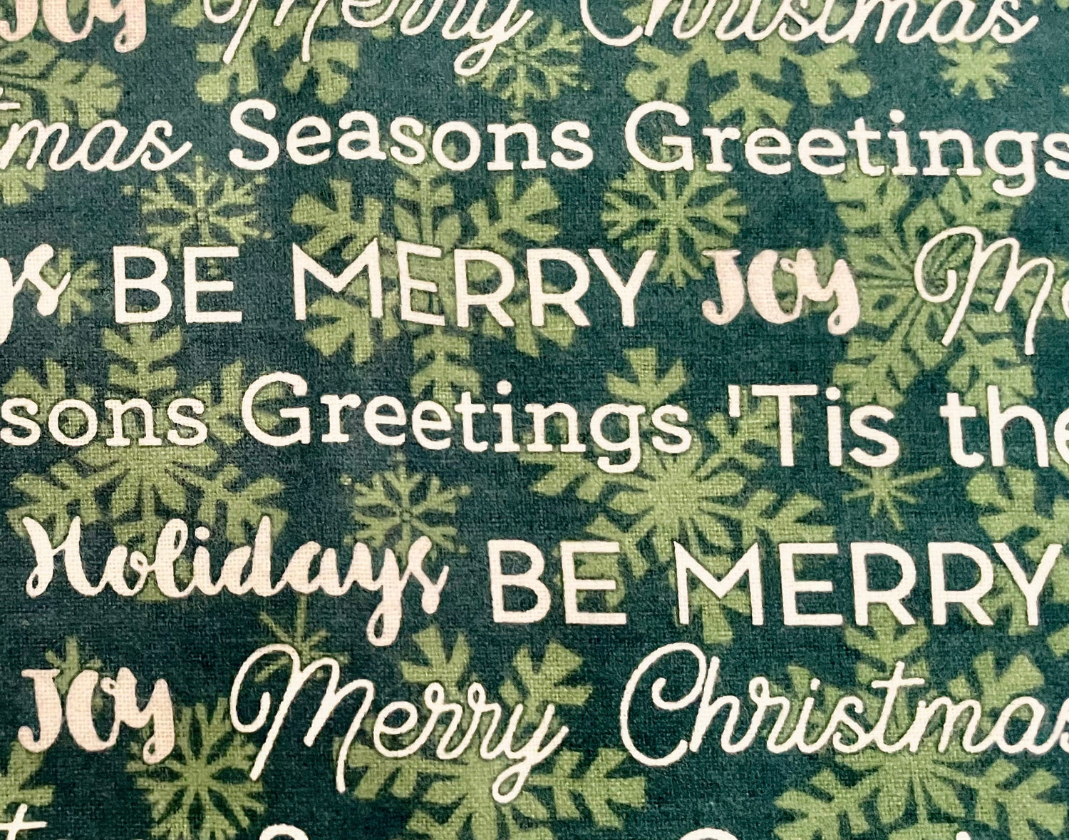 This beautiful deep green cotton features MERRY in many versions; as well as Christmas, Joy, holidays and more. Simple and elegant! The reverse side is a warm matching green flannel. Handmade by Sisters Sewing Kindness Sue Grandi and Nancy Johnson. Free shipping and only one in stock!