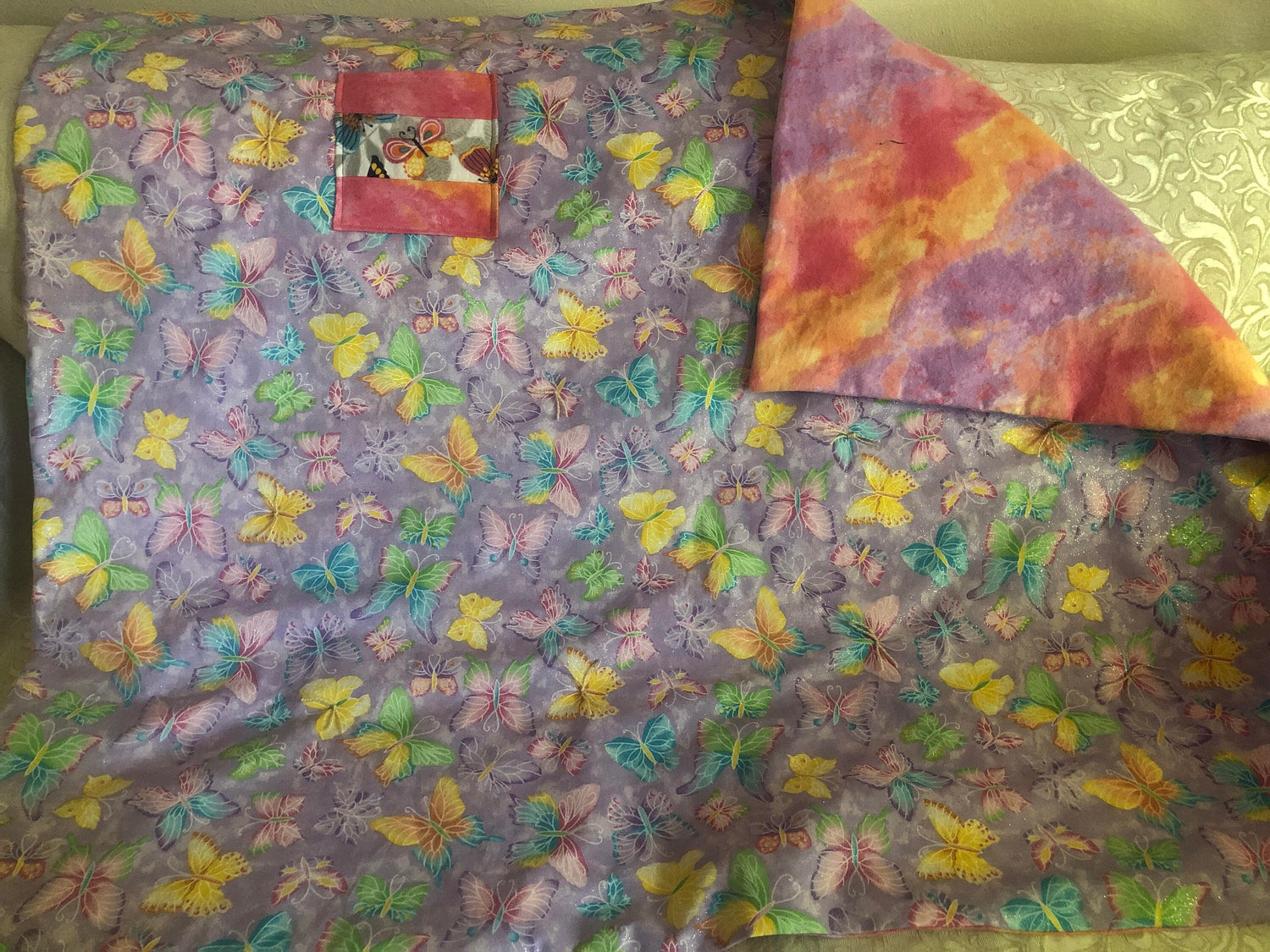 This beautiful butterfly lap quilt and throw is perfect for child and adult alike. It is made of high quality flannel on both sides. The front has a pocket large enough for a cell phone and other small items. The pocket also serves as a decoration. The fabric is prewashed and reversible. With dimensions of 44" x 34", it is small enough to use on road trips and other outings. It is often used as a throw behind the couch when not being used as a lap quilt or around the shoulders on chilly evenings. Made by Sue Grandi and Nancy Johnson of Sisters Sewing Seeds of Kindness.