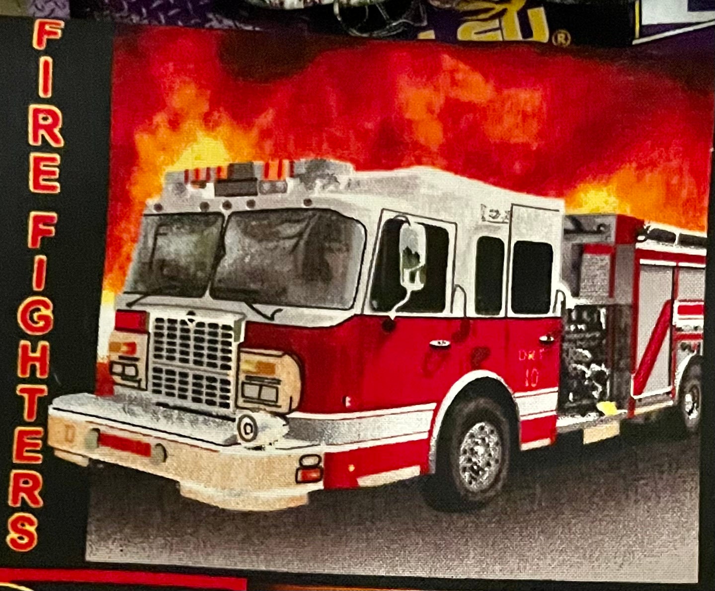 This blanket has everything to respect about brave firefighters! Flames, the latter, the truck, the Logo, inspiring messages and more. Then the reverse side is warm and soft smoke flannel. Handmade by sisters Sue Grandi (86 yrs young) and Nancy Johnson (81 yrs young) who’s father was a Firefighter. Free shipping!