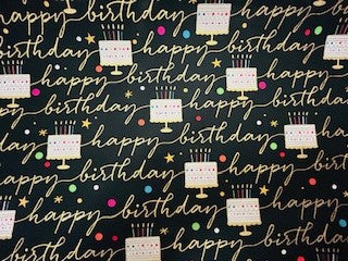 This is the best Birthday Present and Blanket because it features colorful cakes with candles and happy birthday beautifully written in gold which pop against rich black cotton. It'll be a gift they'll treasure their whole life! Then the reverse side is warm solid flannel. At 48" by 36" it's the perfect size for any room or lap! Handmade by Sisters Sue and Nancy. FREE SHIPPING, Machine Washable and can be giftwrapped.