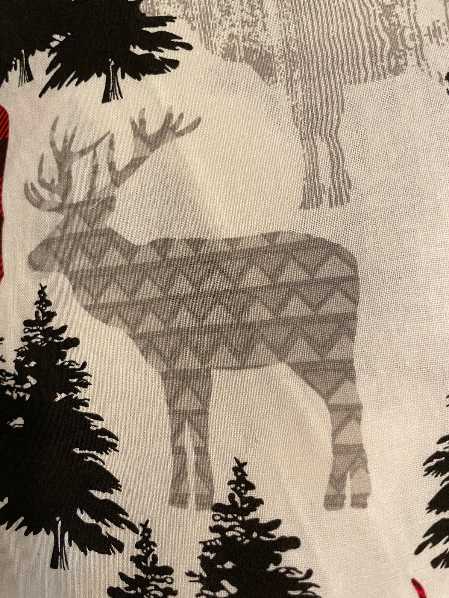 This designer blanket is perfect for any home who wants to bring in the warmth of a cabin! Deers in multiple different plaids and patterns with Christmas trees make it beautiful! And at 46” by 35” it’s perfect size for any couch or to keep you warm. Then the reverse side is a complimentary soft warm solid blank flannel. Handmade by Sisters Sue Grandi and Nancy Johnson. Free shipping and 3 in stock!