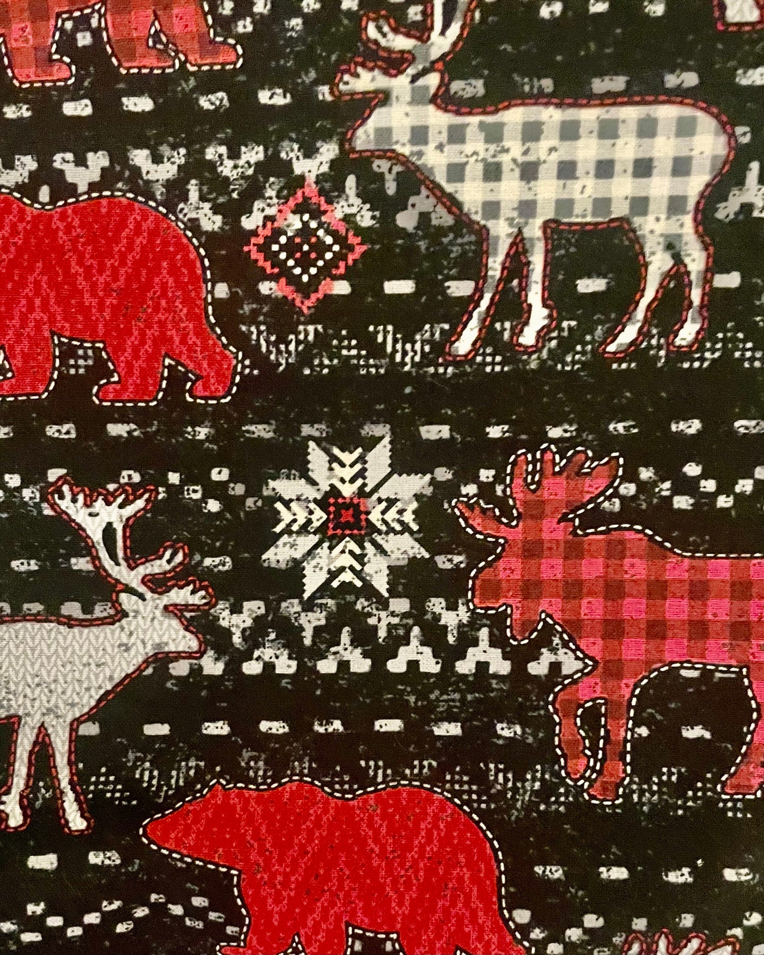 This cozy, popular blanket features deer, bear and more in red, black and white plaids and solids which pop against rich black cotton with white snowflakes and more… then the reverse side is soft and warm solid black flannel. Handmade by sweet Sisters sewing kindness Sue Grandi and Nancy Johnson. Free shipping!