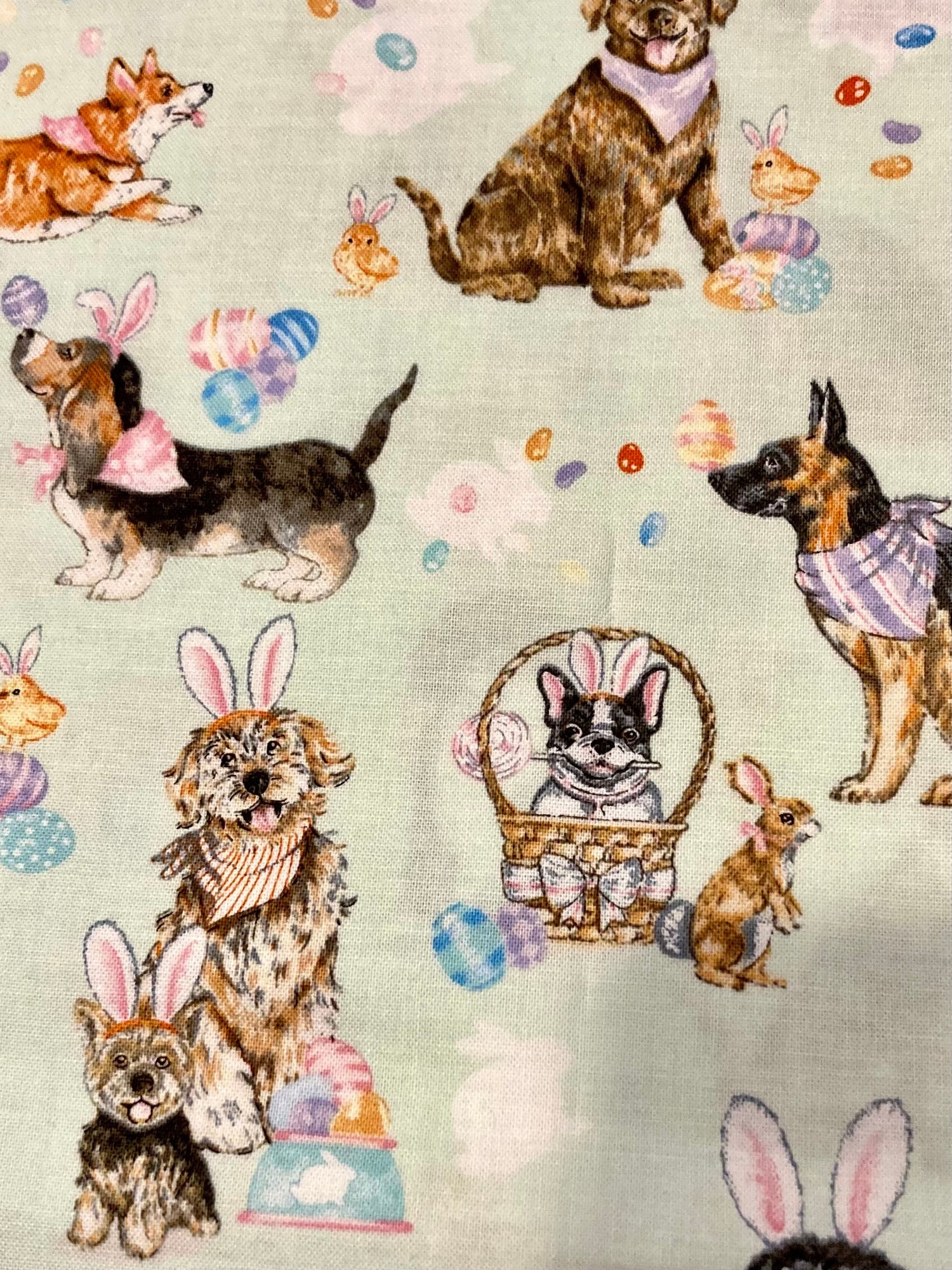 This adorable fabric features every popular dog from Pug, corky, Weiner, Shepard, lab and more ready for Easter! Bonnets, baskets, eggs and more pop against a classic blue gingham plaid. Then the reverse side is solid warm flannel. Handmade by Sue Grandi and Nancy Johnson. Free shipping!