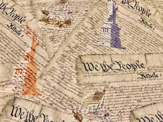 This stunning Patriotic blanket features everything sacred about our Country from the Declaration of Independence, Flag, Liberty Bell, Abraham Lincoln, 1776, Statue of Liberty and more. Then the reverse side is a soft and warm navy flannel with stars. Handmade by Sisters Sue Grandi (age 86) and Nancy Johnson (age 81) who's late husbands proudly served in the Military. FREE SHIPPING and limited stock.
