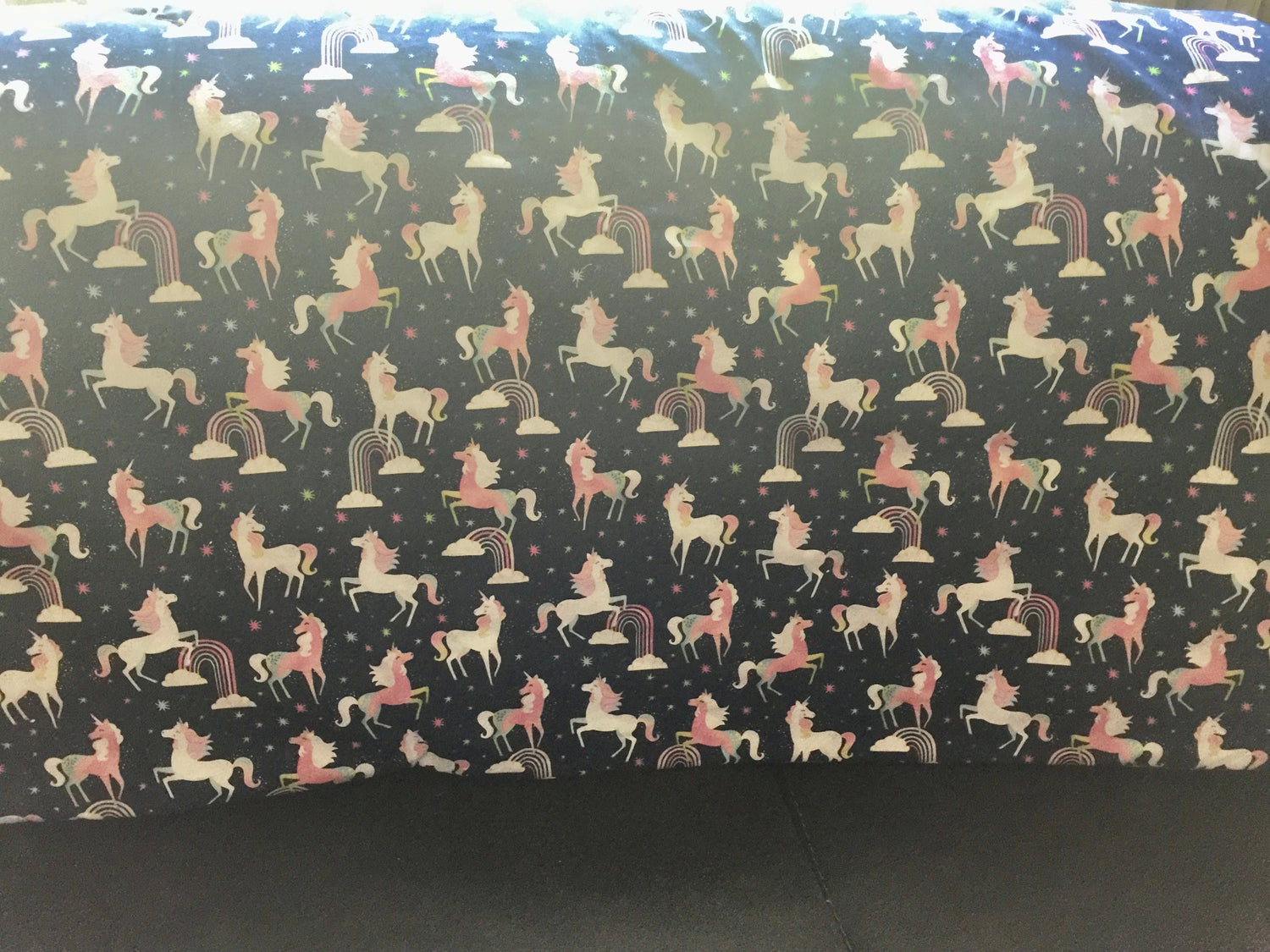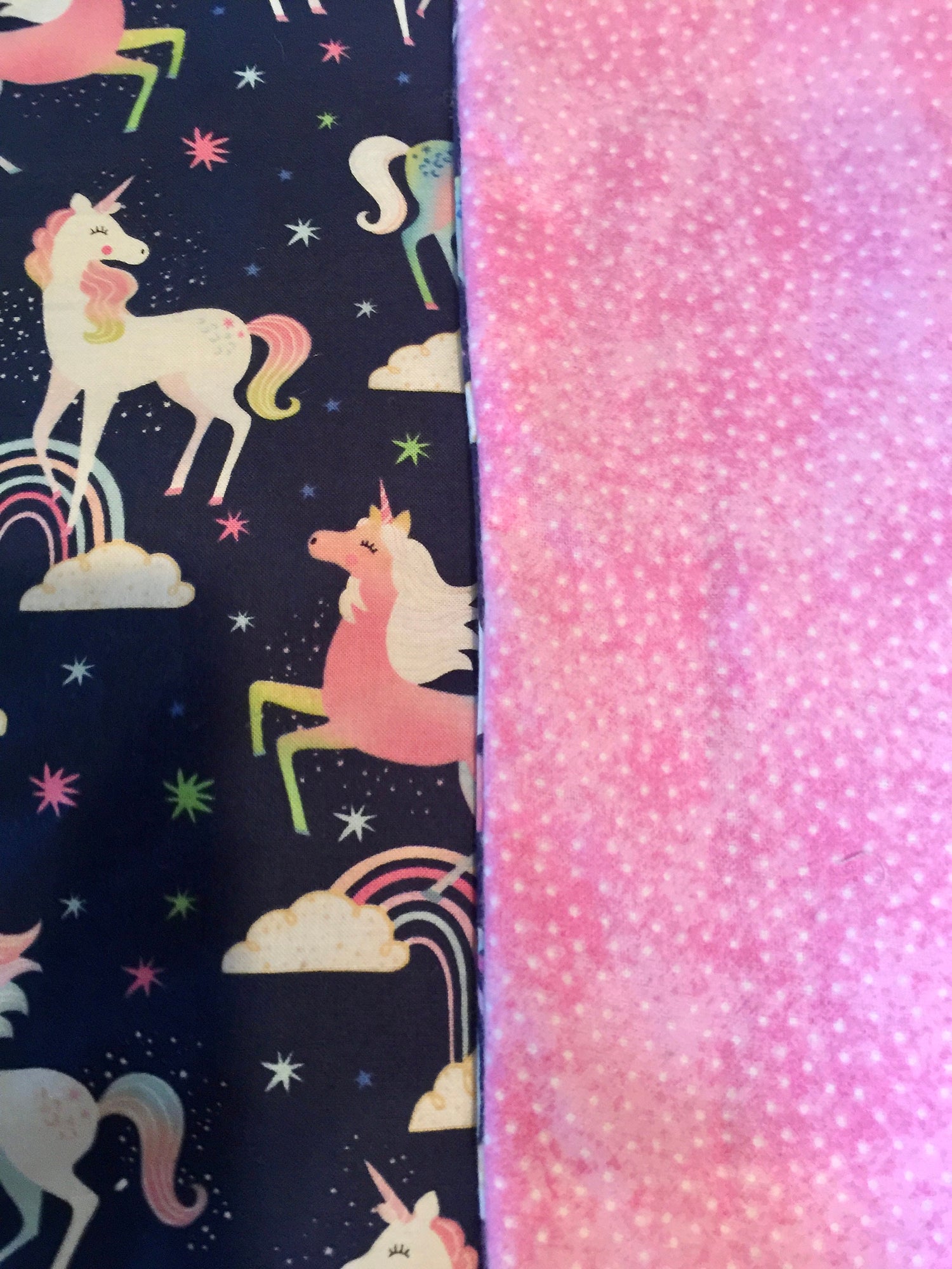 This designer reversible blanket or twin bedding of highest quality cotton features colorful unicorns and rainbows against a classy dark blue. The reverse side is a beautiful matching pink in soft cotton flannel. Handmade by Sisters Sewing kindness Sue Grandi and Nancy Johnson who sow kindness by sewing. Free shipping and machine washable