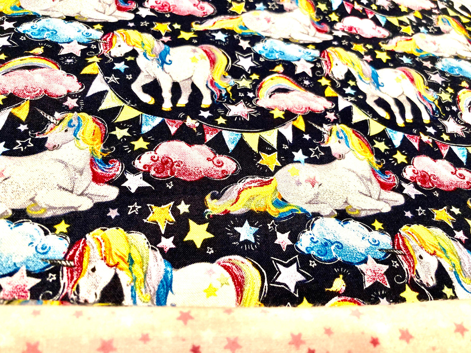 This rich blanket features beautiful white unicorns with rainbow tails, mane and unicorn! Truly one of a kind. Then the reverse side is a warm soft pink with Gold Stars fleece so it’s two blankets in one! Handmade by Sisters Sewing Kindness Sue Grandi (age 84 going on 24) and Nancy Johnson (age 76 going on 16). Only 2 available with free shipping.