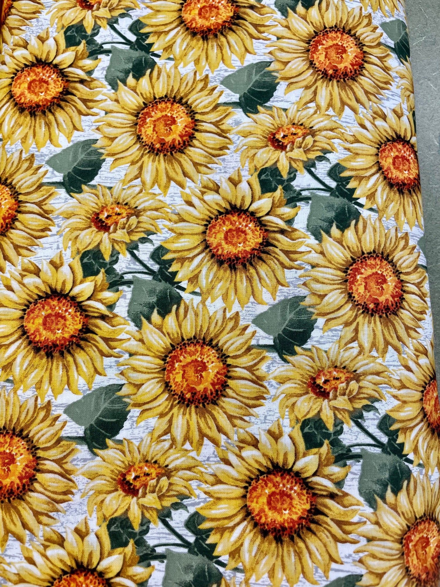 This gorgeous designer cotton features beautifully drawn sunflowers with hints of burnt orange making it cheerful and elegant. Then the reverse side is a soft warm yellow to match. Handmade by sisters sewing kindness Sue Grandi and Nancy Johnson. Free shipping!