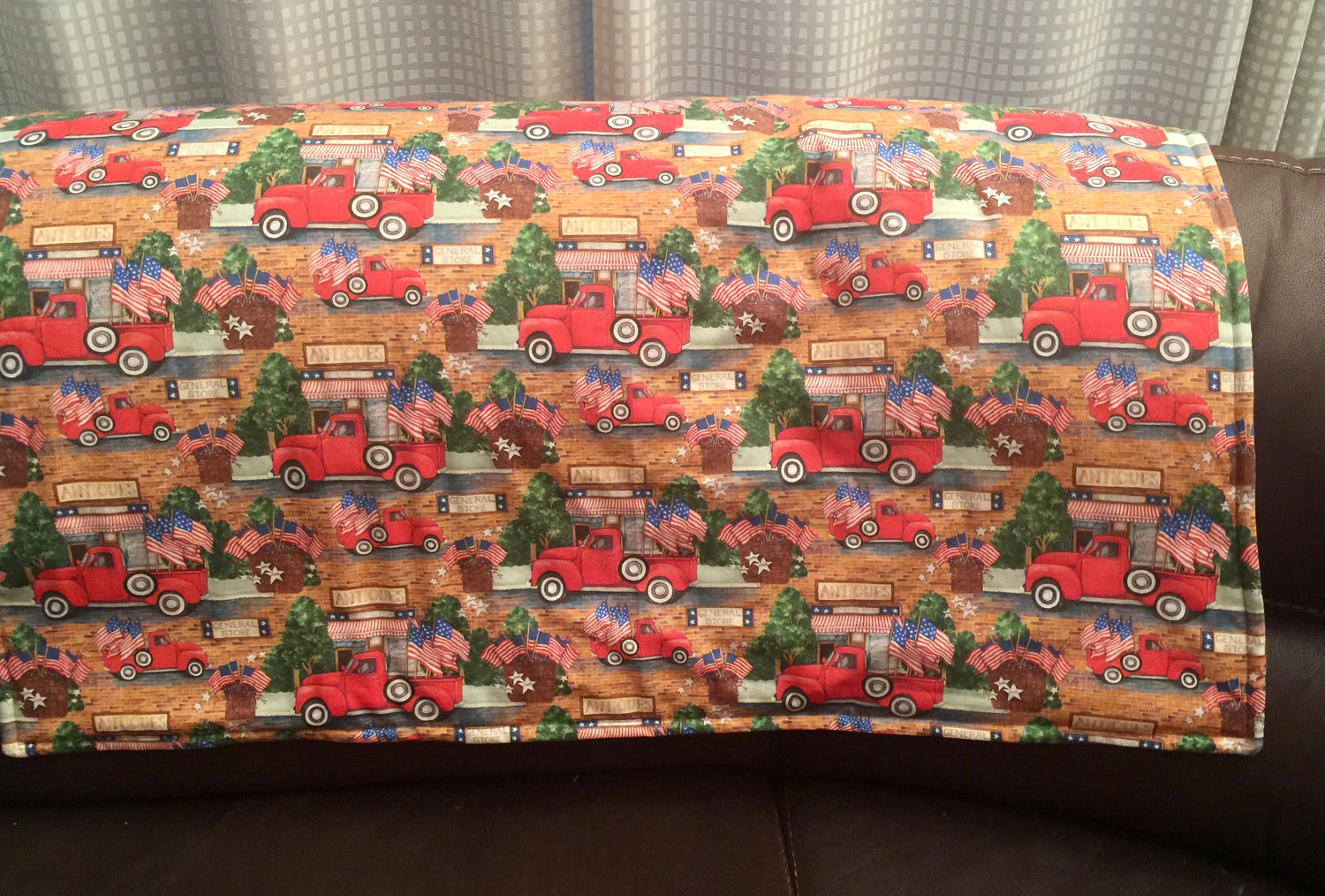 This heart warming soft blanket personifies all things hometown with a pickup truck, flags, stars and more. The reversible side is a soft navy flannel for warmth. This is the perfect gift for anyone or accent to a home, camper or truck. Handmade by Sisters Sewing Kindness Sue Grandi and Nancy Johnson who are retired great grandmothers who sow kindness with their sowing. Free shipping!