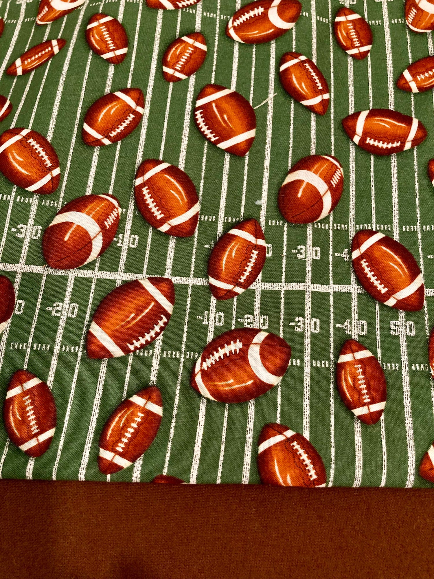 This is the perfect football blanket regardless of your team! Designer fabric features footballs and the field against rich deep green. The reverse side is a soft brown perfect for keeping you warm at a tailgate, media room or anywhere. Handmade by Sisters Sewing Kindness Sue Grandi (age 84) and Nancy Johnson (age 76). Only two in stock and free shipping and available now! Machine washable